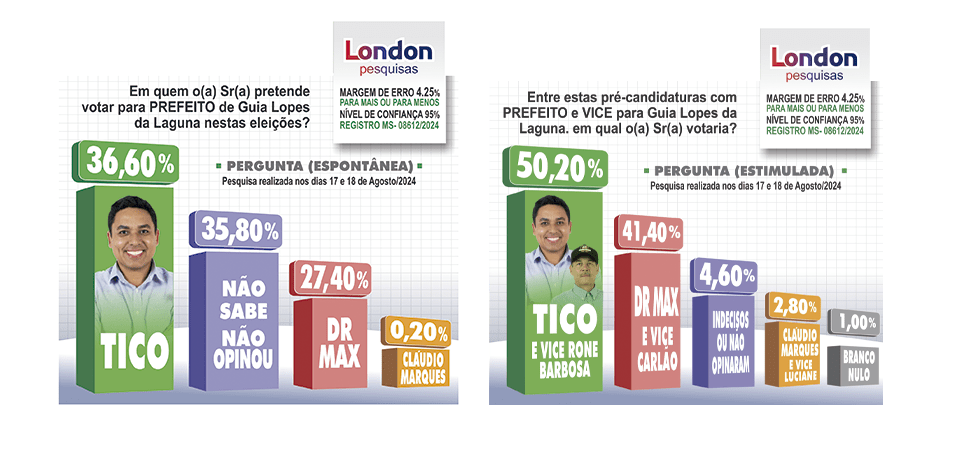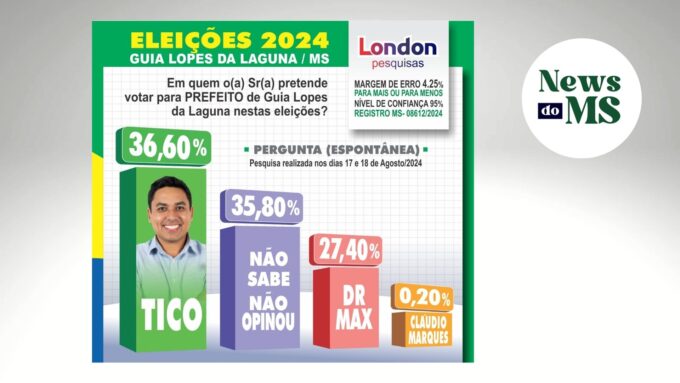 Uma pesquisa realizada em Guia Lopes da Laguna pelo Instituto London, registrada no TSE sob o número MS-08612/2024 foi publicada nesta terça-feira (20) e mostra os candidatos Tico e Rone Barbosa na liderança pela disputa da prefeitura municipal.